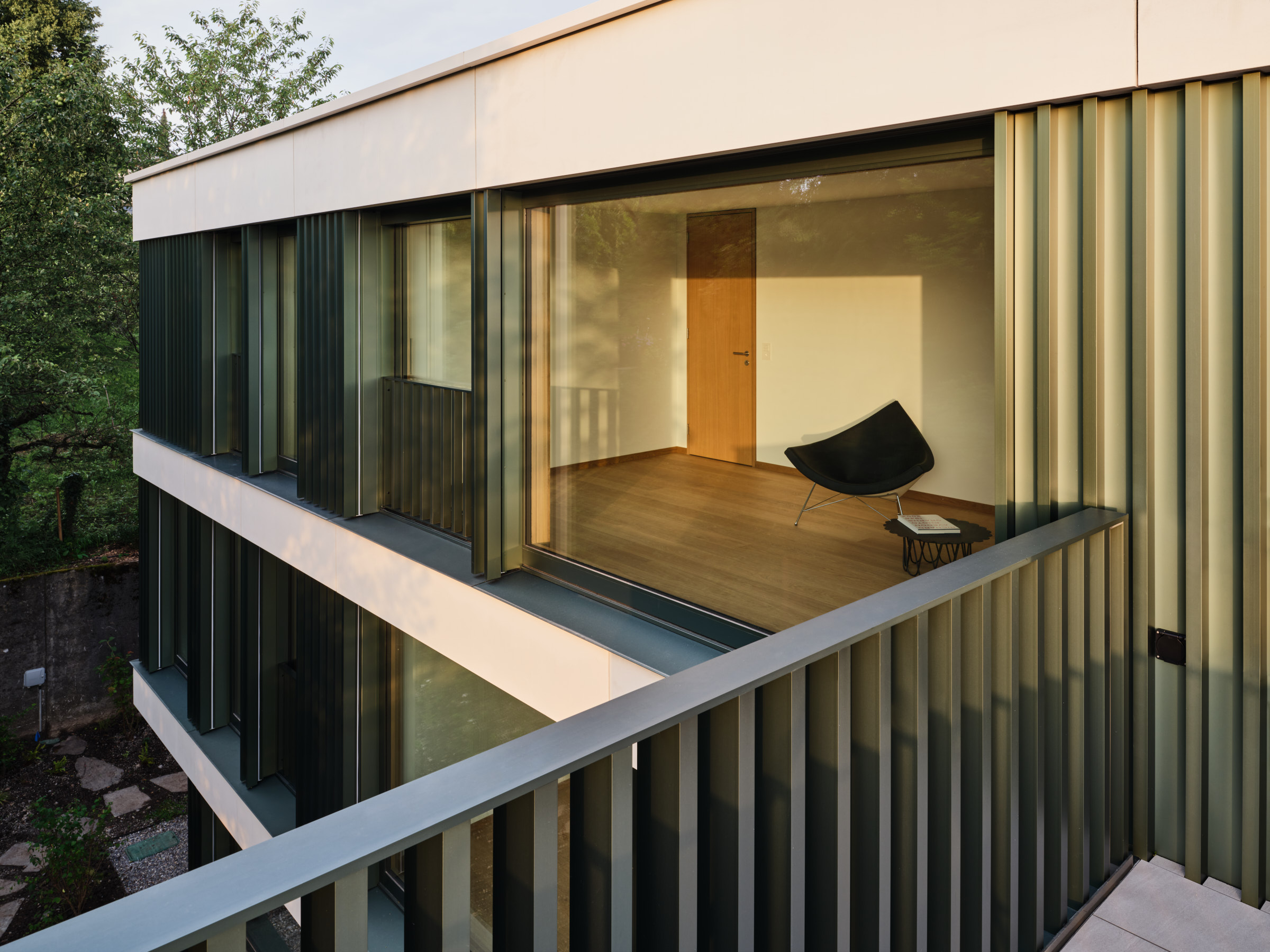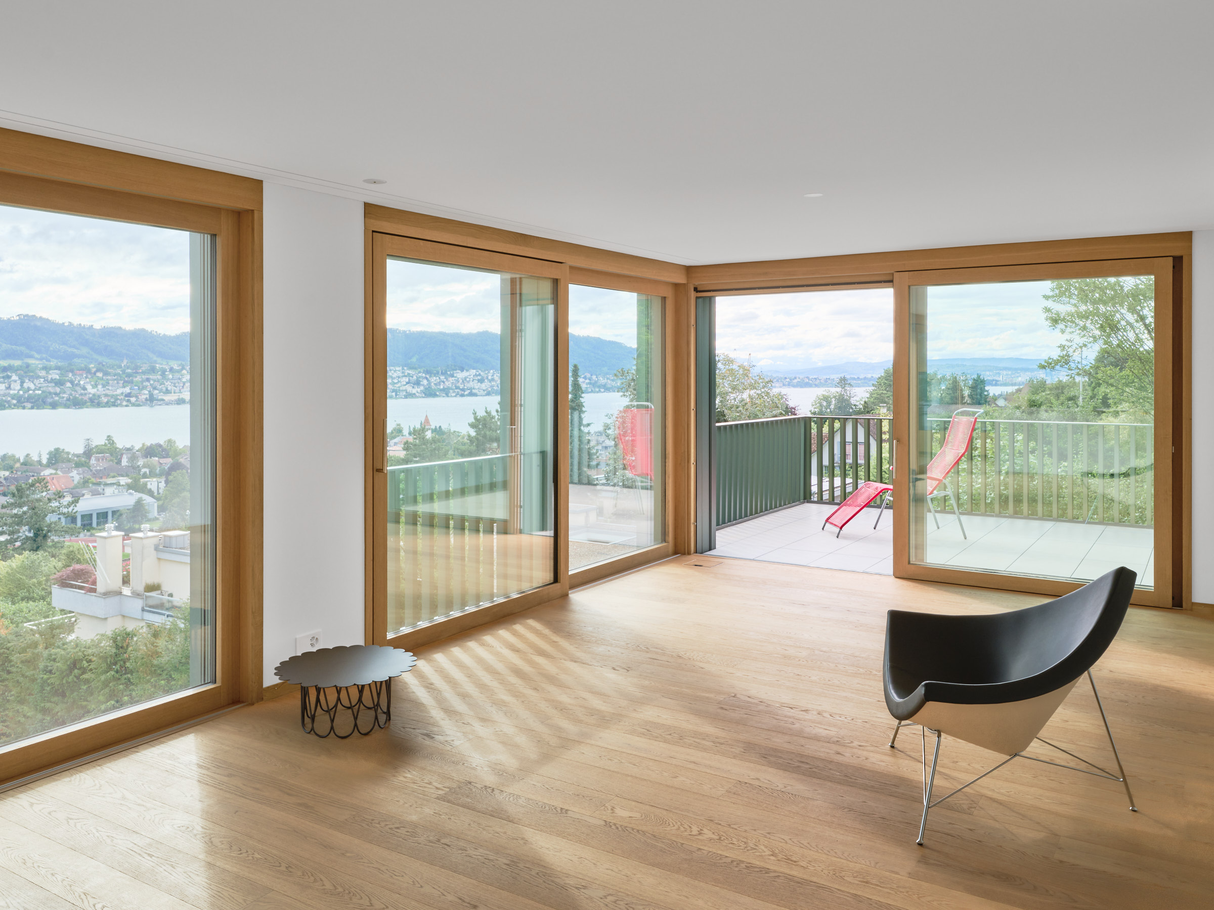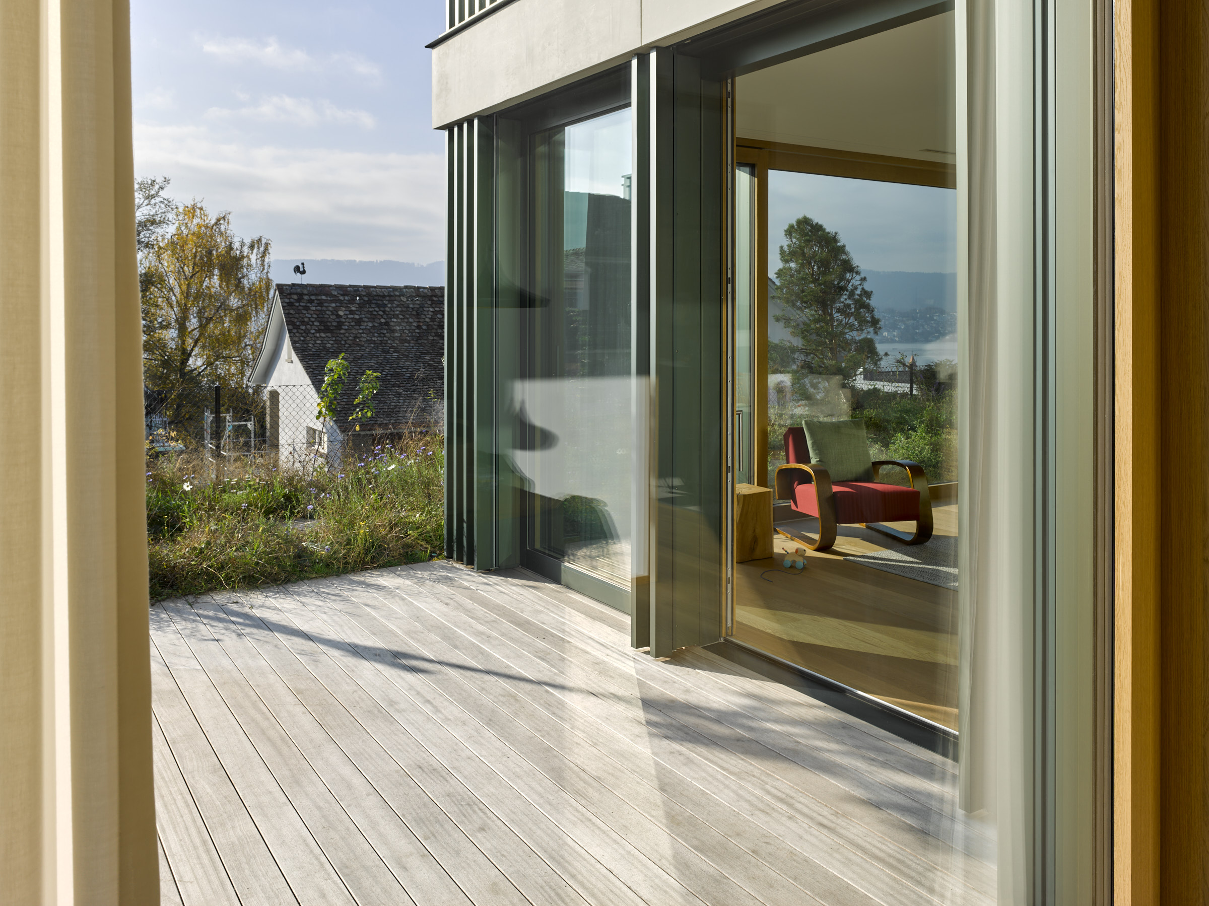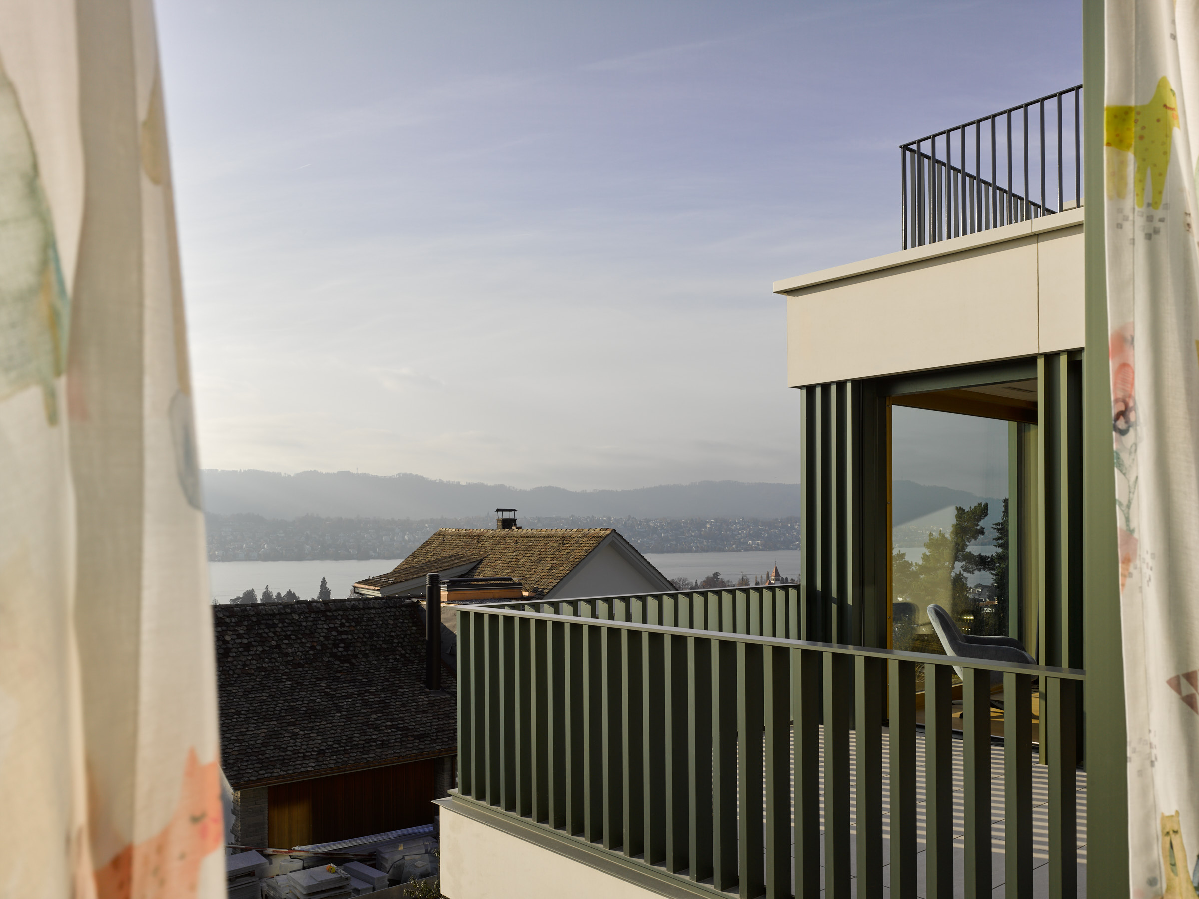 Der Leitgedanke des Einfamilienhausteils war die Verschmelzung des Wohn- und Essbereichs im Erdgeschoss mit dem grosszügigen Garten. Die Intimität dieses Haus- und Gartenteils wird dadurch maximiert und es entstehen ineinander übergehende Innen- und Aussenräume. Ein Paradies für spielende Kinder und naturverbundene Eltern. Parallel zum introvertierten Garten- und Wohnbereich wurde auch eine weitläufige Dachterrasse mit Dachgarten konzipiert. Dadurch bleibt die Intimität der Wohnräume erhalten, ohne dass auf die extrovertierte Öffnung in Richtung See verzichtet werden müsste.