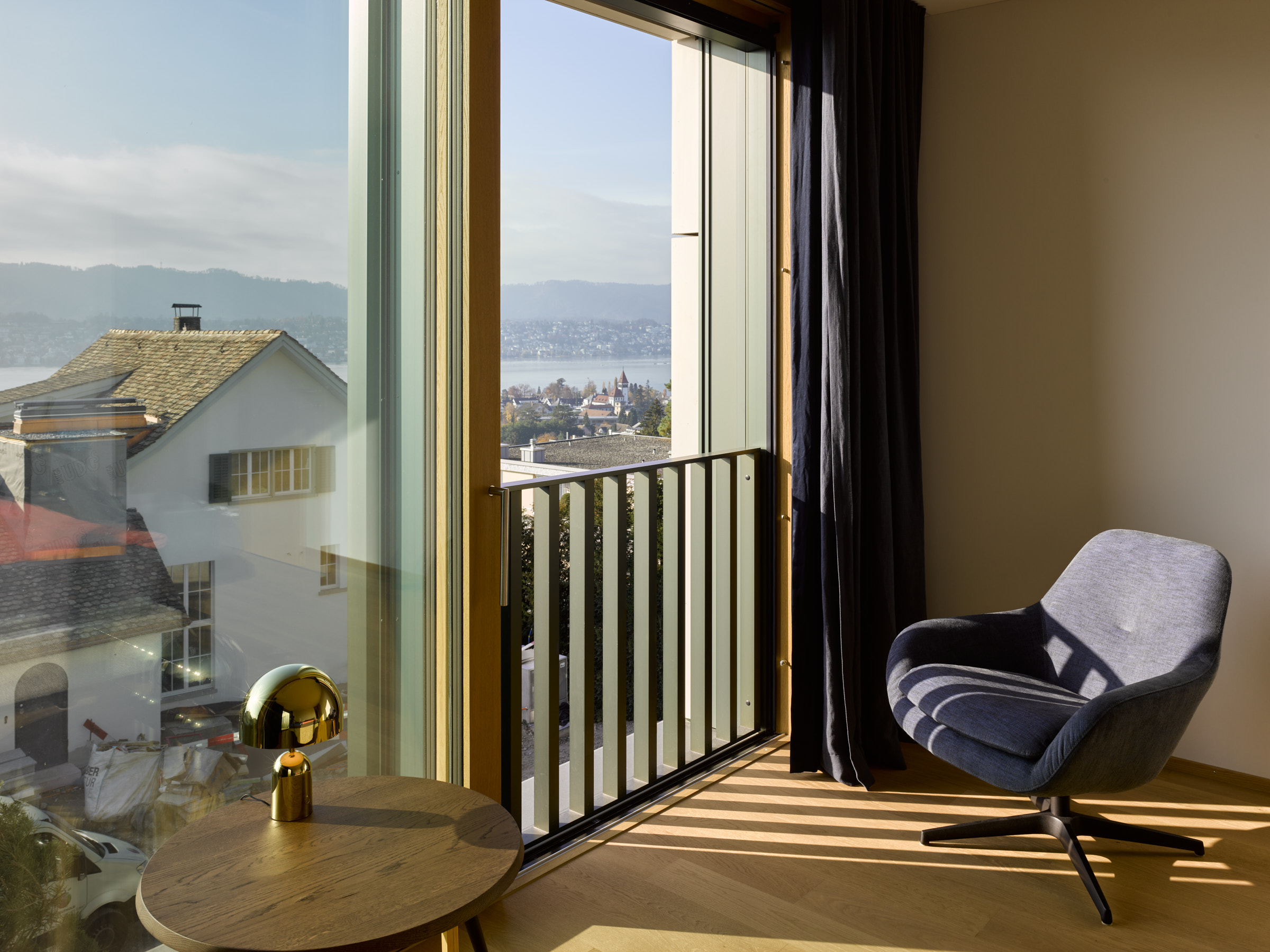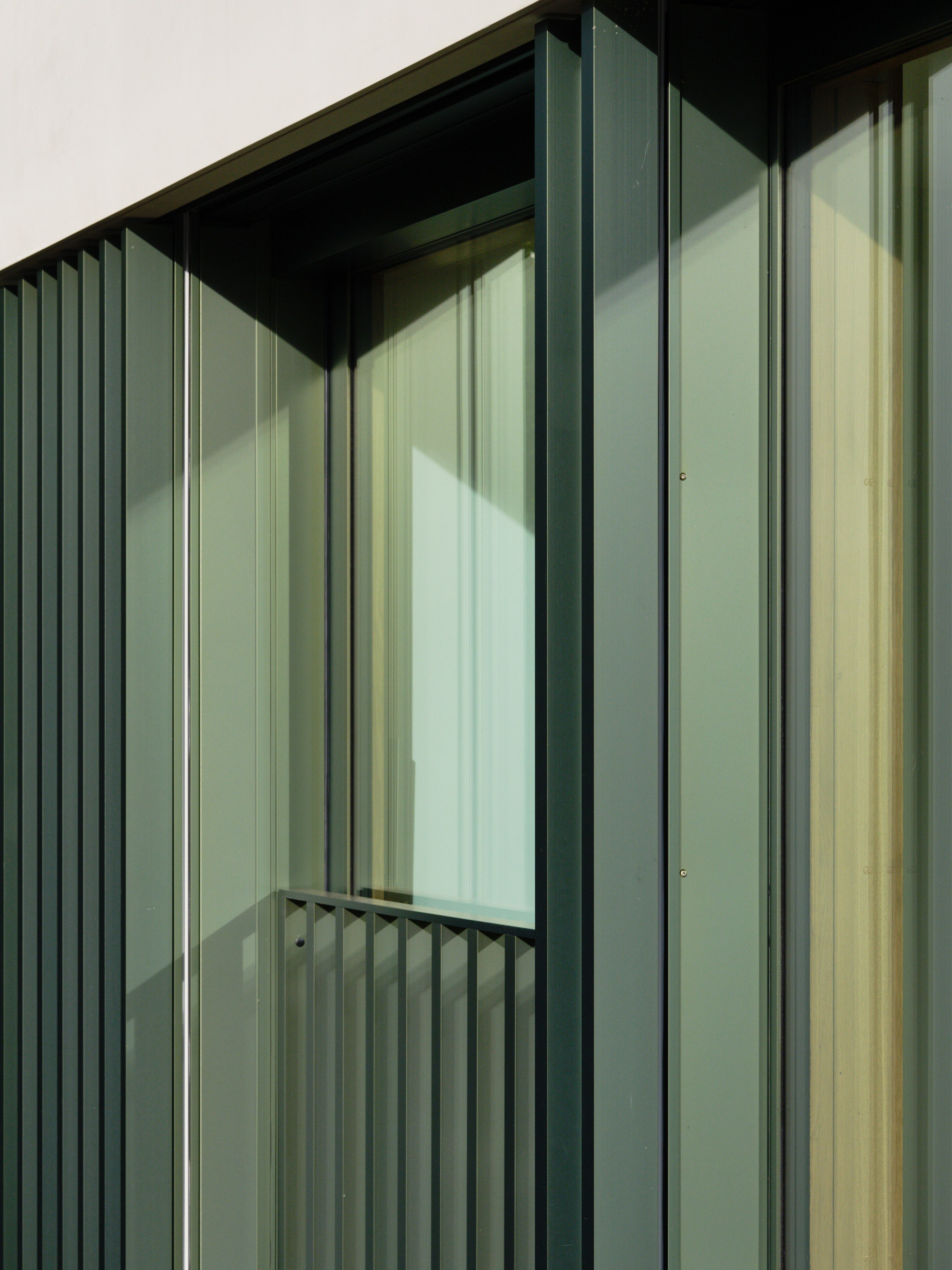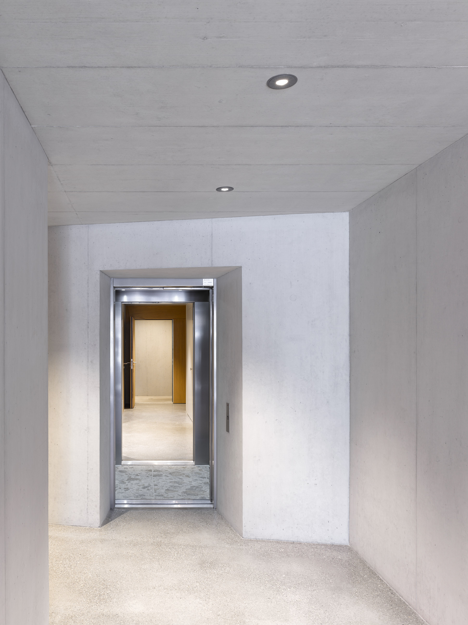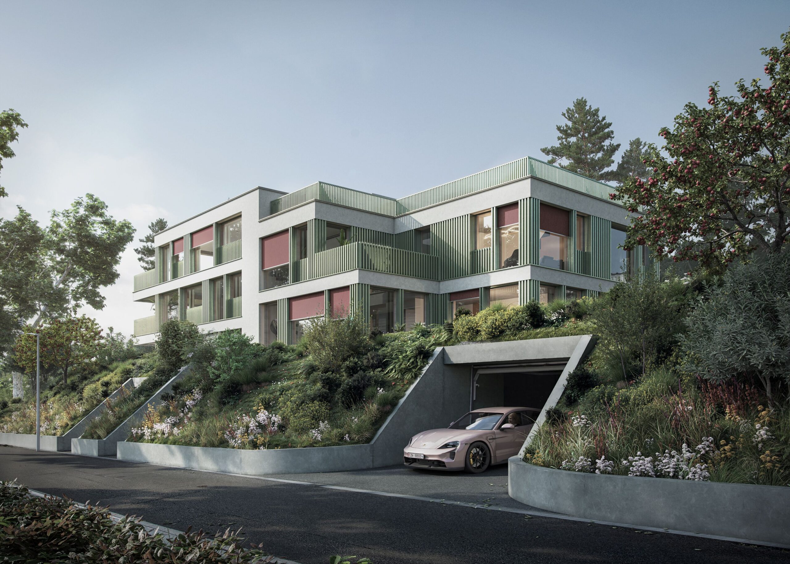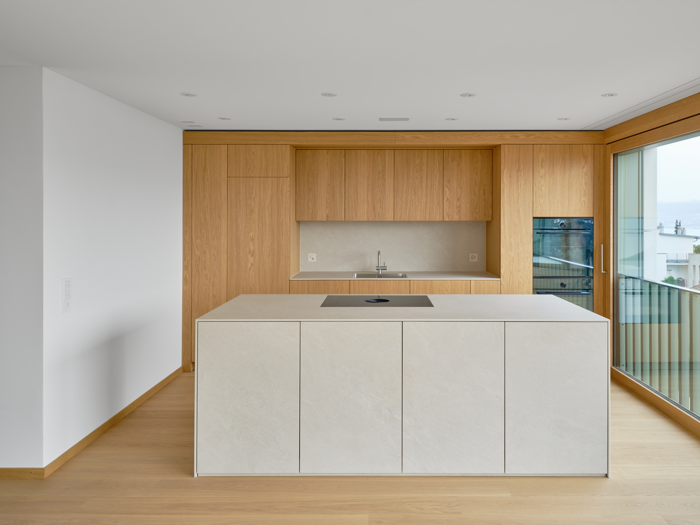 Der Leitgedanke des Einfamilienhausteils war die Verschmelzung des Wohn- und Essbereichs im Erdgeschoss mit dem grosszügigen Garten. Die Intimität dieses Haus- und Gartenteils wird dadurch maximiert und es entstehen ineinander übergehende Innen- und Aussenräume. Ein Paradies für spielende Kinder und naturverbundene Eltern. Parallel zum introvertierten Garten- und Wohnbereich wurde auch eine weitläufige Dachterrasse mit Dachgarten konzipiert. Dadurch bleibt die Intimität der Wohnräume erhalten, ohne dass auf die extrovertierte Öffnung in Richtung See verzichtet werden müsste.