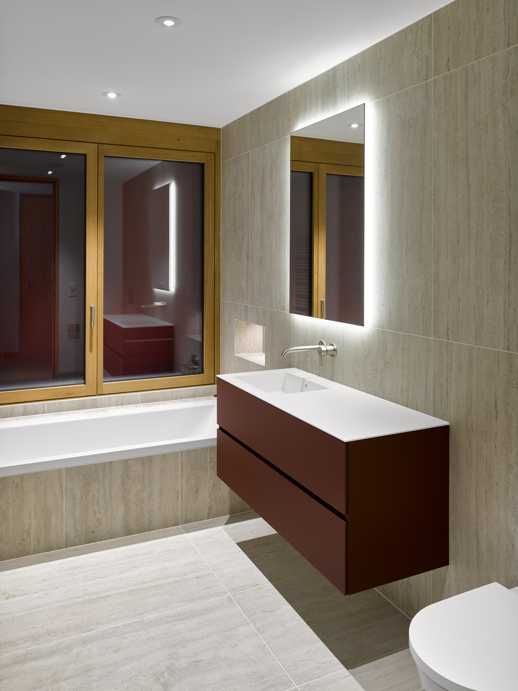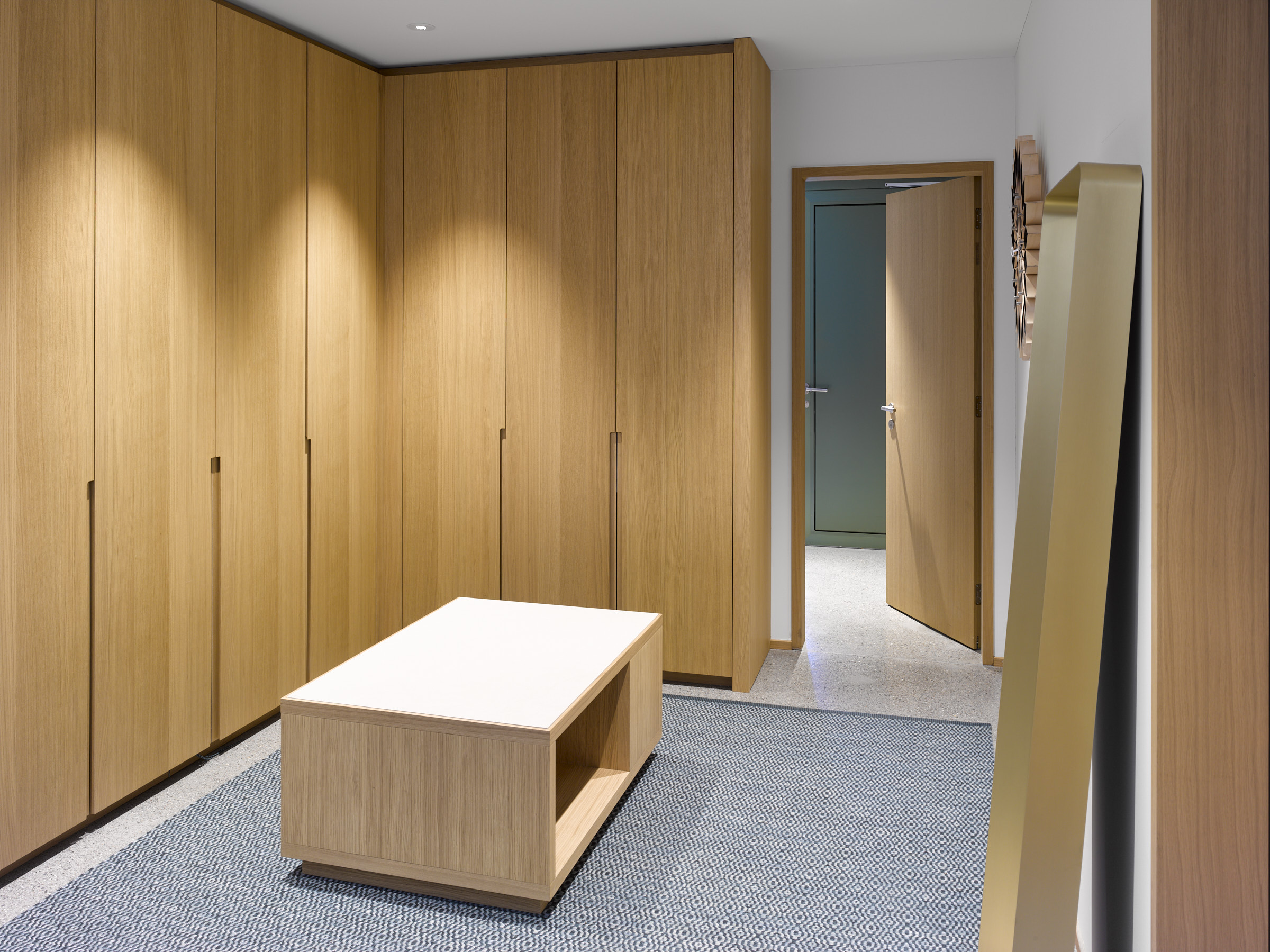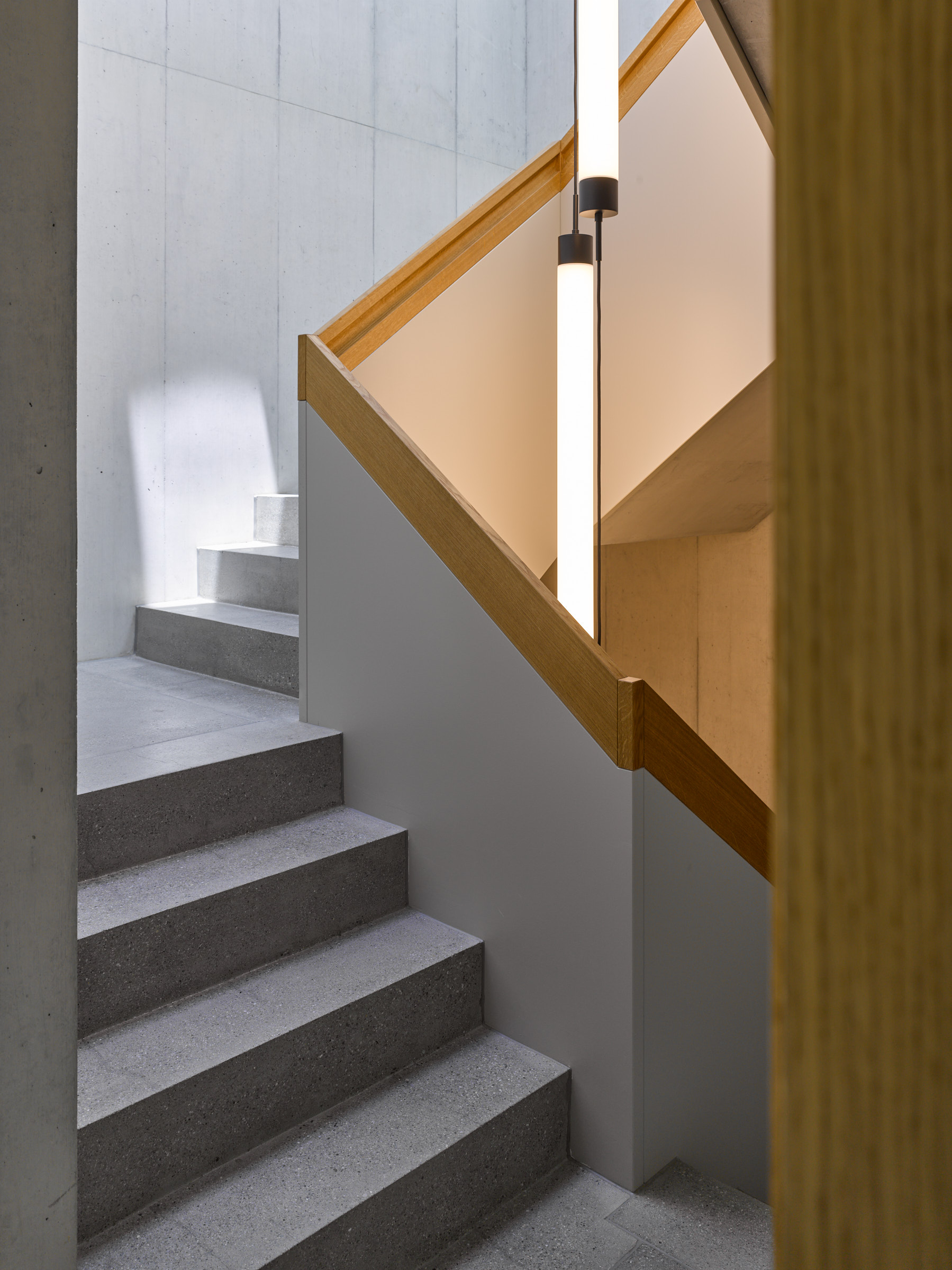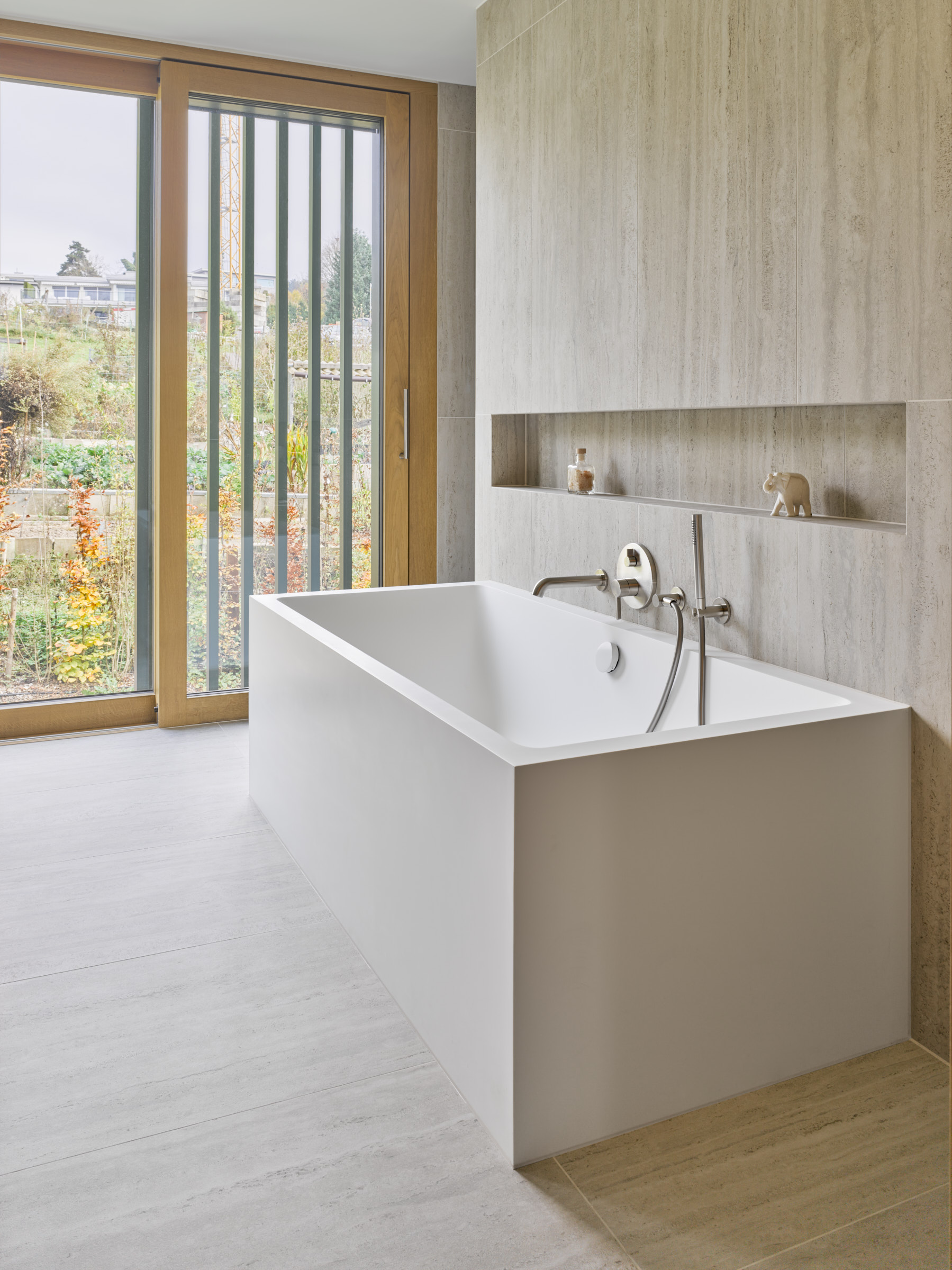 Der Leitgedanke des Einfamilienhausteils war die Verschmelzung des Wohn- und Essbereichs im Erdgeschoss mit dem grosszügigen Garten. Die Intimität dieses Haus- und Gartenteils wird dadurch maximiert und es entstehen ineinander übergehende Innen- und Aussenräume. Ein Paradies für spielende Kinder und naturverbundene Eltern. Parallel zum introvertierten Garten- und Wohnbereich wurde auch eine weitläufige Dachterrasse mit Dachgarten konzipiert. Dadurch bleibt die Intimität der Wohnräume erhalten, ohne dass auf die extrovertierte Öffnung in Richtung See verzichtet werden müsste.